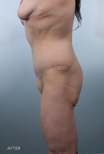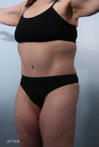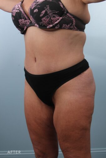 This very sweet 55 year old lost over 50lbs after bariatric surgery and as a result developed a significant amount of excess skin in her abdomen and some residual fat on the love handle areas. She got exactly what she wanted with a panniculectomy and tummy tuck with liposuction of the love handles and abdomen.
