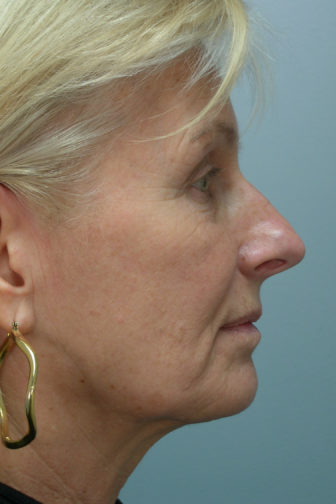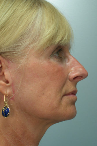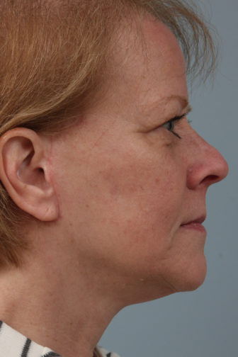 She decided to have the Weekend Neck Lift and Facial Liposuction. Notice the improvement in her profile, her jaw and neckline have a much more youthful look. The incision line along the edge of the ear in the after picture is still red and more prominent than it will be after a few months. This picture was taken about 5 weeks after surgery.
